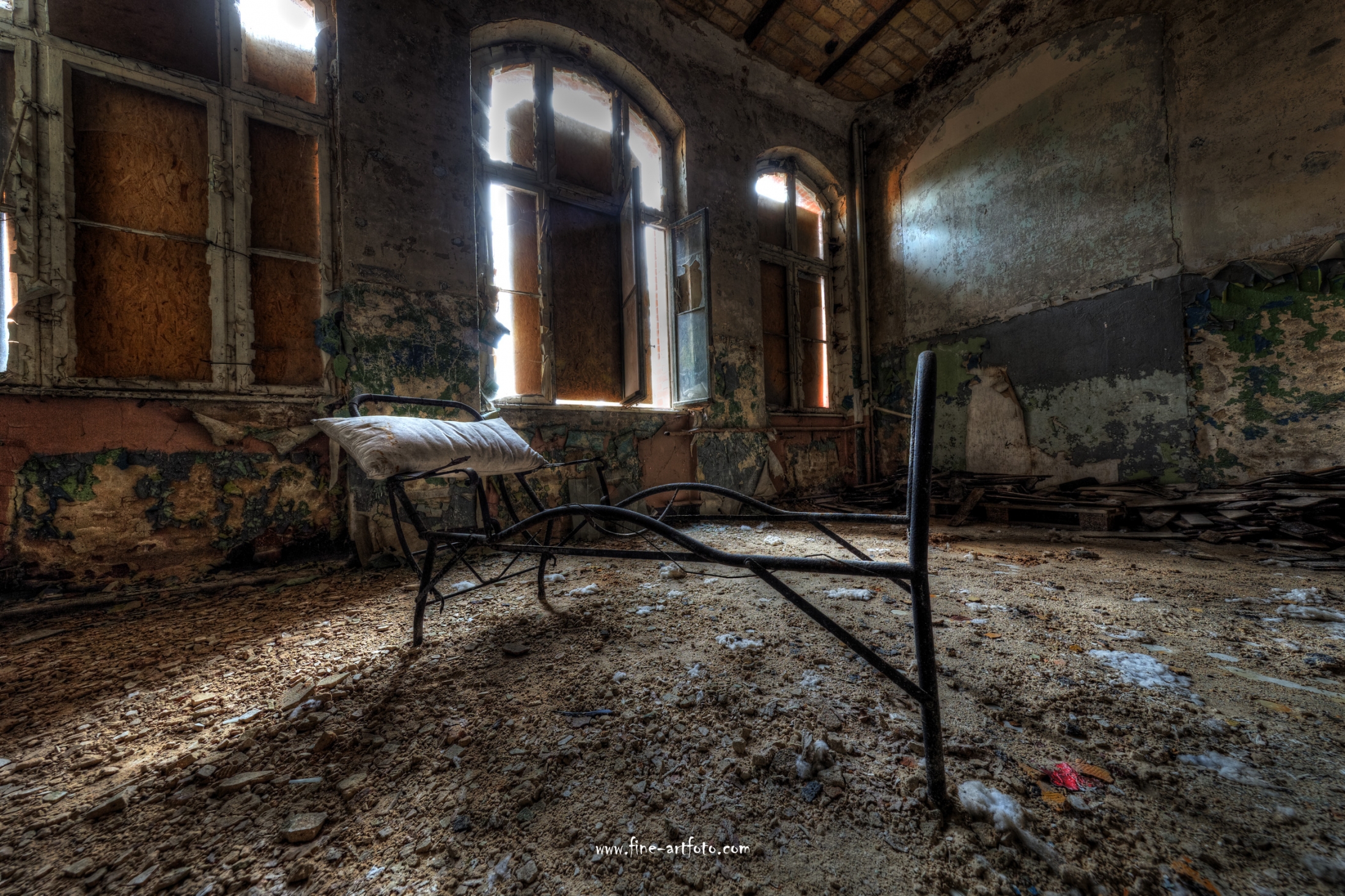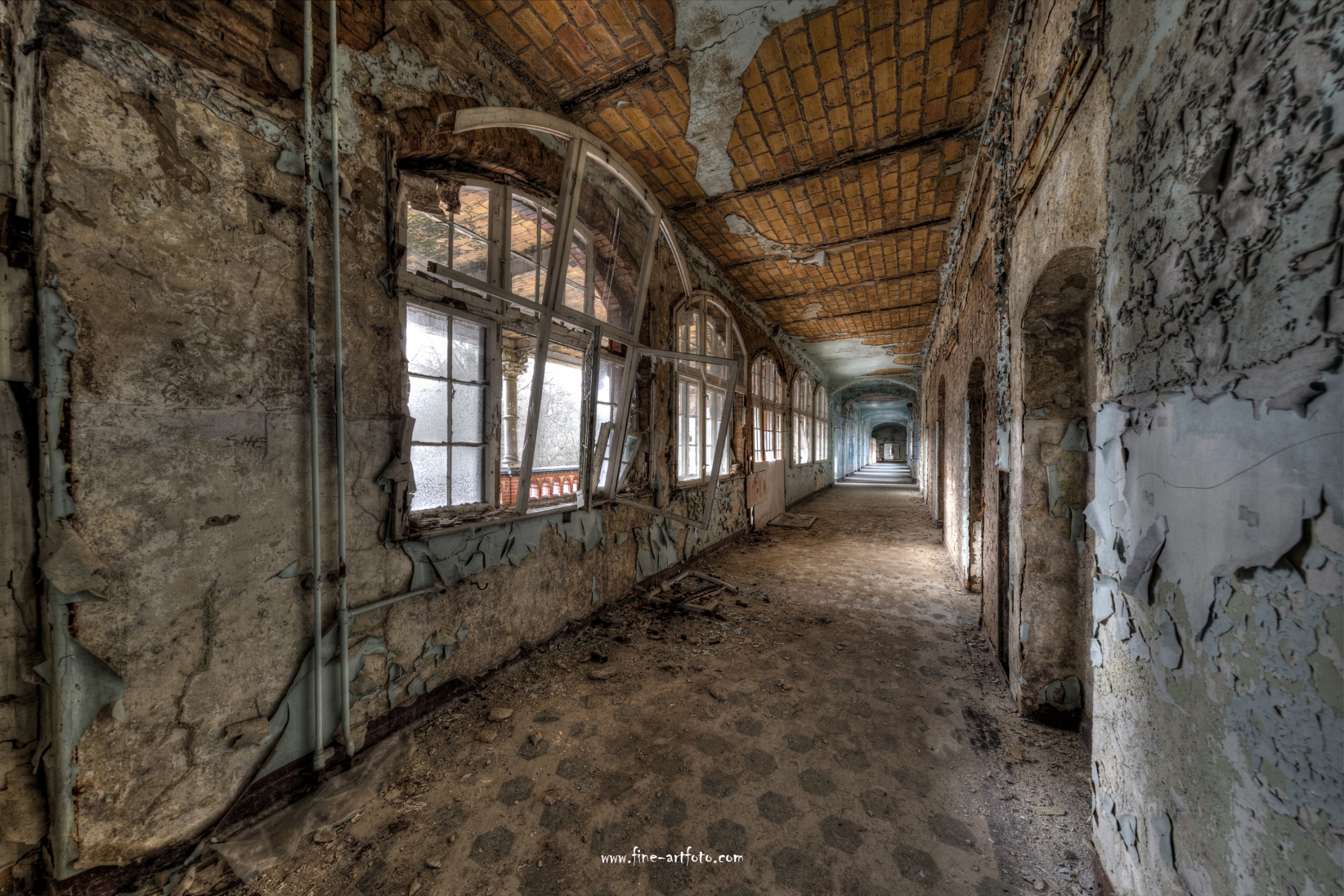 Beelitz today is corridors and flaking color. Interior, lamps and beds are now fully lost and disapeared.
