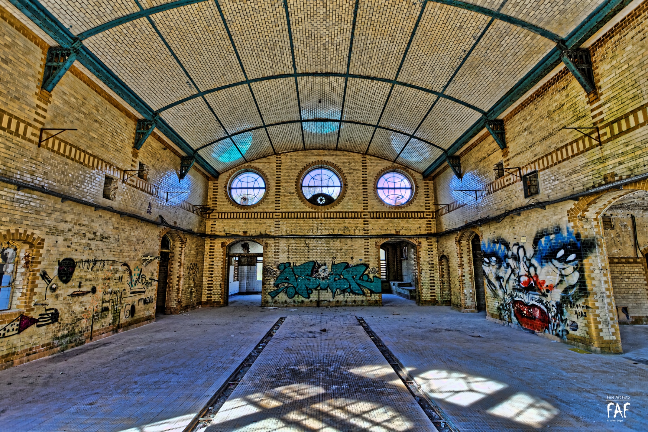 Given up in 1994. The owners went bankrupt in 2001. The place is so vast that, after being deserted could not be protected. Soon the typical Berlin Problem emerged. Vandalism, Graffiti (but not that much), and dropouts were roaming the place. Comparing photos over the years show the strong destruction of this place.