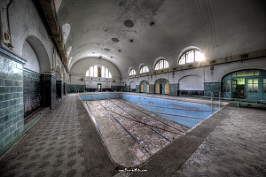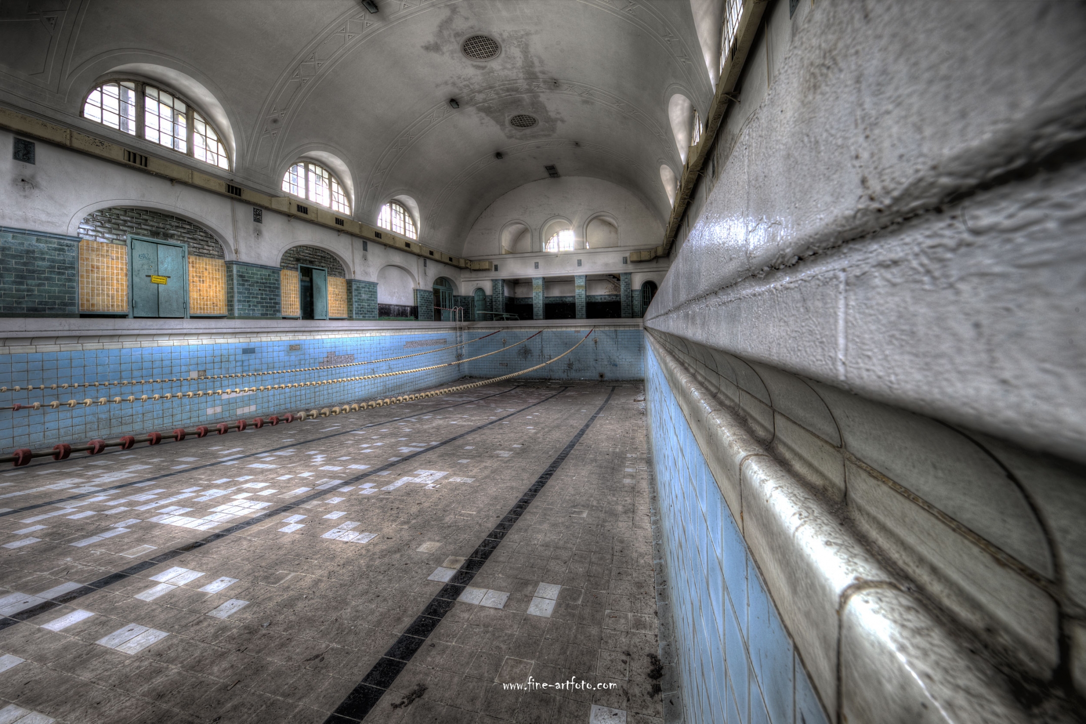 This nice swimming pool lies hidden deep in Germany´s forests. It is part of larger conglomerate of buildings. All lost for a long time. The nice part here is that it is basically untouched. No vandalism and graffiti and a lot of interiour is still undamaged at its place. The place looks like humans just vanished like the water that evaporated from the pool having the lane dividers still now hanging in the air.